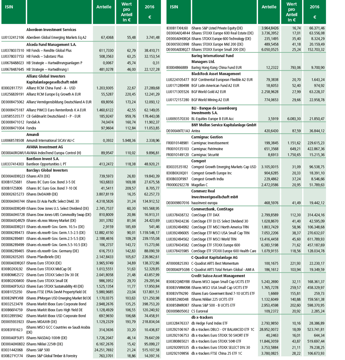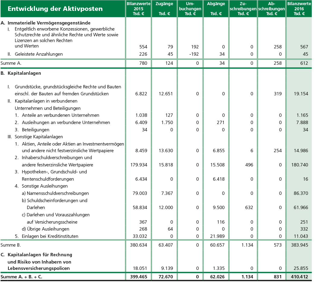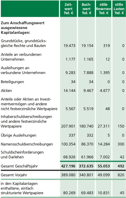 Die Bewertung erfolgte zum Anschaffungswert. Die positiven Bewertungsreserven belaufen sich auf 14.284 Tausend Euro, die stillen Lasten betragen zum Bilanzstichtag 300 Tausend Euro.