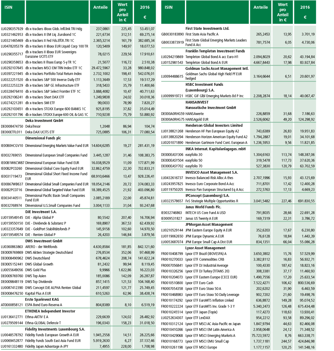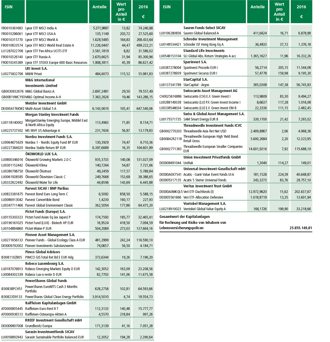 Die InterRisk Lebensversicherungs-AG hält 100 % der Anteile der InterRisk Informatik GmbH und der AMADI GmbH. Der Jahresüberschuss 2016 belief sich bei der InterRisk Informatik GmbH auf 1,2 Tausend Euro bei einem Eigenkapital von 39 Tausend Euro. Die AMADI GmbH erwirtschaftete einen Jahresüberschuss von 1,1 Tausend Euro bei einem Eigenkapital von 36 Tausend Euro. Die Bewertung erfolgt zu Anschaffungskosten. Die in Tabelle auf Seite 19 angegebenen Zeitwerte entsprechen den Buchwerten. Beide Gesellschaften haben ihren Sitz in Wiesbaden.