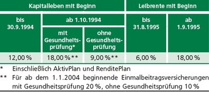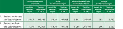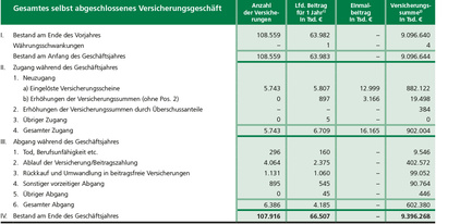 Als Rechnungsgrundlage für den Bestand an Aussteuerversicherungen dient die Heiratstafel 1960 / 62 für Ledige. Bei Leibrentenversicherungen wird für Abschlüsse bis 31.8.1995 die Sterbetafel ST 1987R, für Abschlüsse bis 31.12.2004 die Sterbetafel DAV 1994R und danach die Sterbetafel DAV 2004R angewandt.