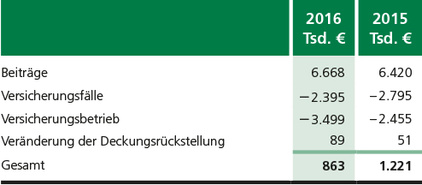 Aus den Kapitalanlagen sowie den für Kosten und Leistungen nicht verbrauchten Beitragsanteilen haben wir einen Rohüberschuss von 32,6 Millionen Euro erwirtschaftet. Davon erhielten unsere Versicherungsnehmer 24,3 Millionen Euro unmittelbar (Direktgutschrift) sowie weitere 3,9 Millionen Euro mittelbar durch Dotierung der Rückstellung für Beitragsrückerstattung (RfB). Der verbleibende Gewinn von 4,4 Millionen Euro wird auf Basis des bestehenden Gewinnabführungsvertrages an die InterRisk Versicherungs-AG VIG abgeführt.