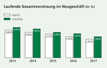 Wir haben daher mit Wirkung zum 1.1.2017 die Zinsüberschussbeteiligung, parallel zur Reduzierung des Höchstrechnungszinses auf 0,9%, zurückgenommen. Zusammen mit dem garantierten Rechnungszins ergibt sich grundsätzlich für Zuteilungen in 2017 eine laufende Verzinsung von 2,8%. Wir sehen uns damit im Wettbewerb gut aufgestellt, insbesondere unter Berücksichtigung unseres hohen Sicherheitsniveaus: die risikobasierte Eigenmittelausstattung nach dem seit Anfang des Jahres 2016 gültigen Solvenzregelwerk beträgt annähend 300%. Eine Spitzenplatzierung bei der Finanzstärke bestätigen auch externe Ratings.