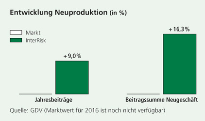 Insgesamt konnte die Neuproduktion gemessen am Jahresbeitrag nach dem starken Anstieg um 26,5% im Vorjahr um weitere 9,0% auf 5,8 Millionen € gesteigert werden. In der größten Sparte Todesfallversicherung verbesserte sich die Neuproduktion ebenfalls um 9,0%. Stärker stiegen das Neugeschäft der Fondsgebundenen Rentenversicherung mit 15,9% und der Berufsunfähigkeitsversicherung mit 38,3%. Die sonstigen Sparten mit kapitalgarantierten Produkten wurden zurückgefahren und spielen eine untergeordnete Rolle.