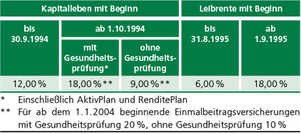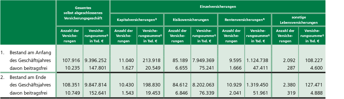 Als Rechnungsgrundlage für den Bestand an Aussteuerversicherungen dient die Heiratstafel 1960 / 62 für Ledige. Bei Leibrentenversicherungen wird für Abschlüsse bis 31.8.1995 die Sterbetafel ST 1987R, für Abschlüsse bis 31.12.2004 die Sterbetafel DAV 1994R und danach die Sterbetafel DAV 2004R angewandt.