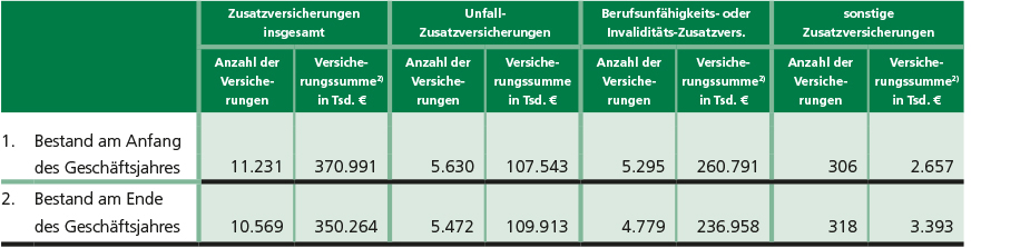 Nach Bildung der Zinszusatzreserve in Höhe von 23,8 Millionen Euro beträgt der bilanzielle Rechnungszins 1,90 %. Die Zinszusatzreserve wurde für den Neubestand gemäß § 5 Absatz 4 Deckungsrückstellungsverordnung gebildet. Die Berechnung der Zinsverstärkung im Altbestand erfolgte mit einem Rechnungszins von 1,9 % gemäß dem genehmigten Geschäftsplan.