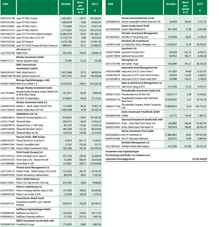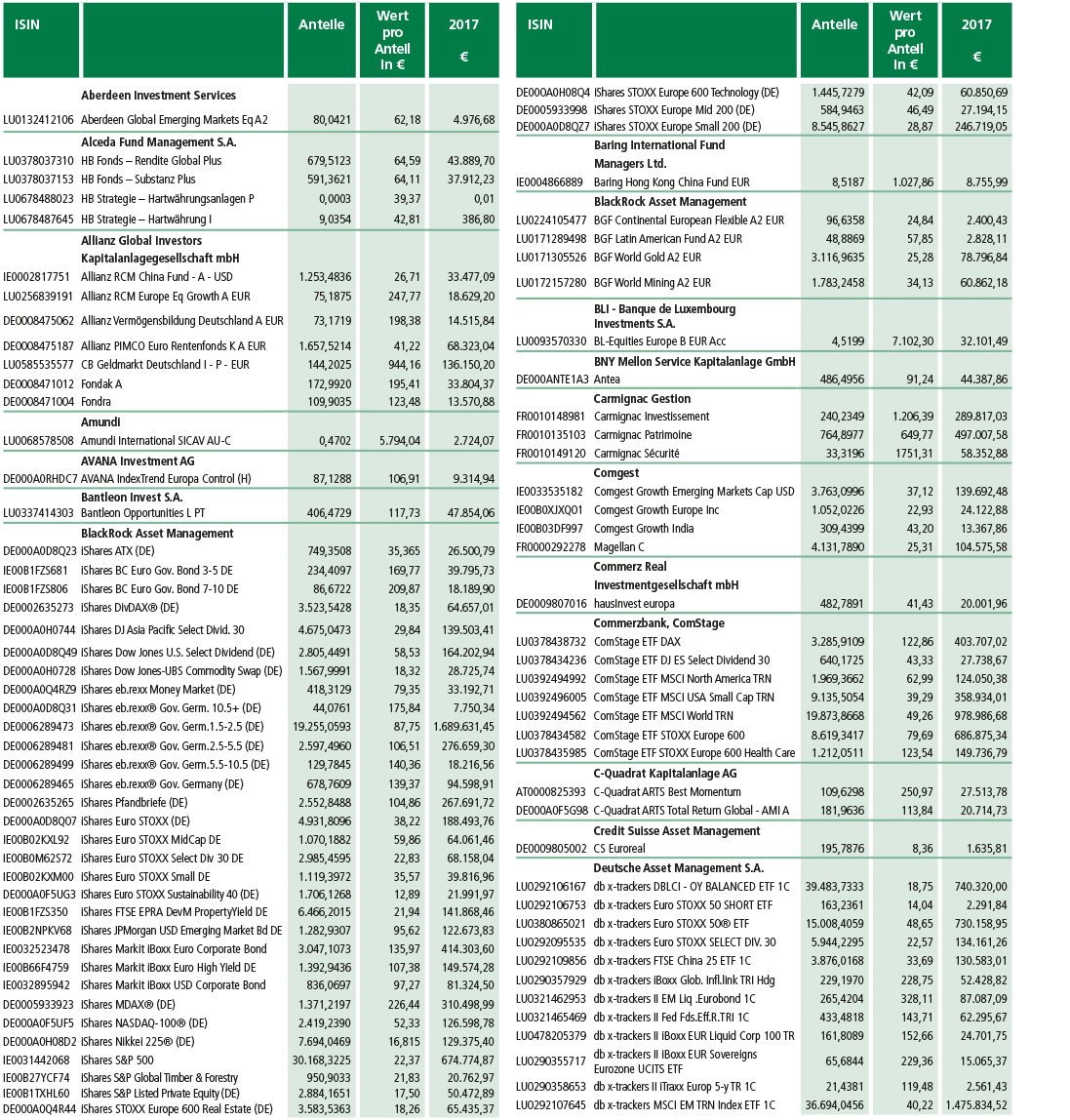 Die Bewertung der dem Umlaufvermögen zugeordneten Aktien, Anteile oder Aktien an Investmentvermögen erfolgt nach dem strengen Niederstwertprinzip. Sie werden zum Zeitwert, höchstens jedoch zu Anschaffungskosten, angesetzt. Wurden Aktien, Anteile oder Aktien an Investmentvermögen gleicher Art und Gattung zu unterschiedlichen Anschaffungskosten erworben, so wurde daraus ein Durchschnittsanschaffungswert gebildet. Die Zeitwerte wurden anhand der Börsenwerte und Rücknahmepreise zum 31.12.2017 ermittelt. Insgesamt beträgt die Abschreibung bei zwei Papieren 69 Tausend Euro.