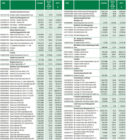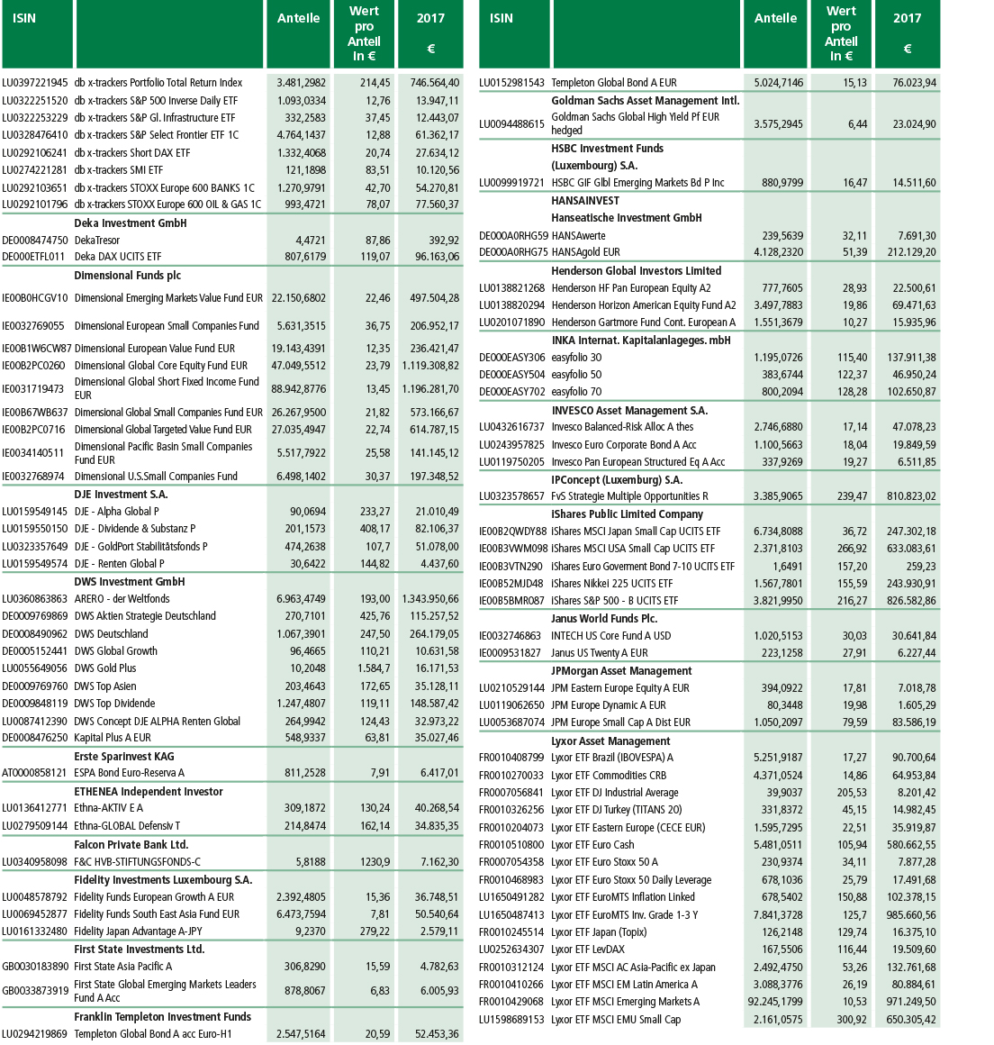Die Zuschreibung bei sechs Papieren beträgt 208 Tausend Euro. Die in dieser Position enthaltenen Immobilienfonds sind dem Anlagevermögen zugeordnet und wurden nach dem gemilderten Niederstwertprinzip bewertet. Für Investmentanteile mit einem Buchwert von 8.161 Tausend Euro ergaben sich stille Lasten von 62 Tausend Euro.