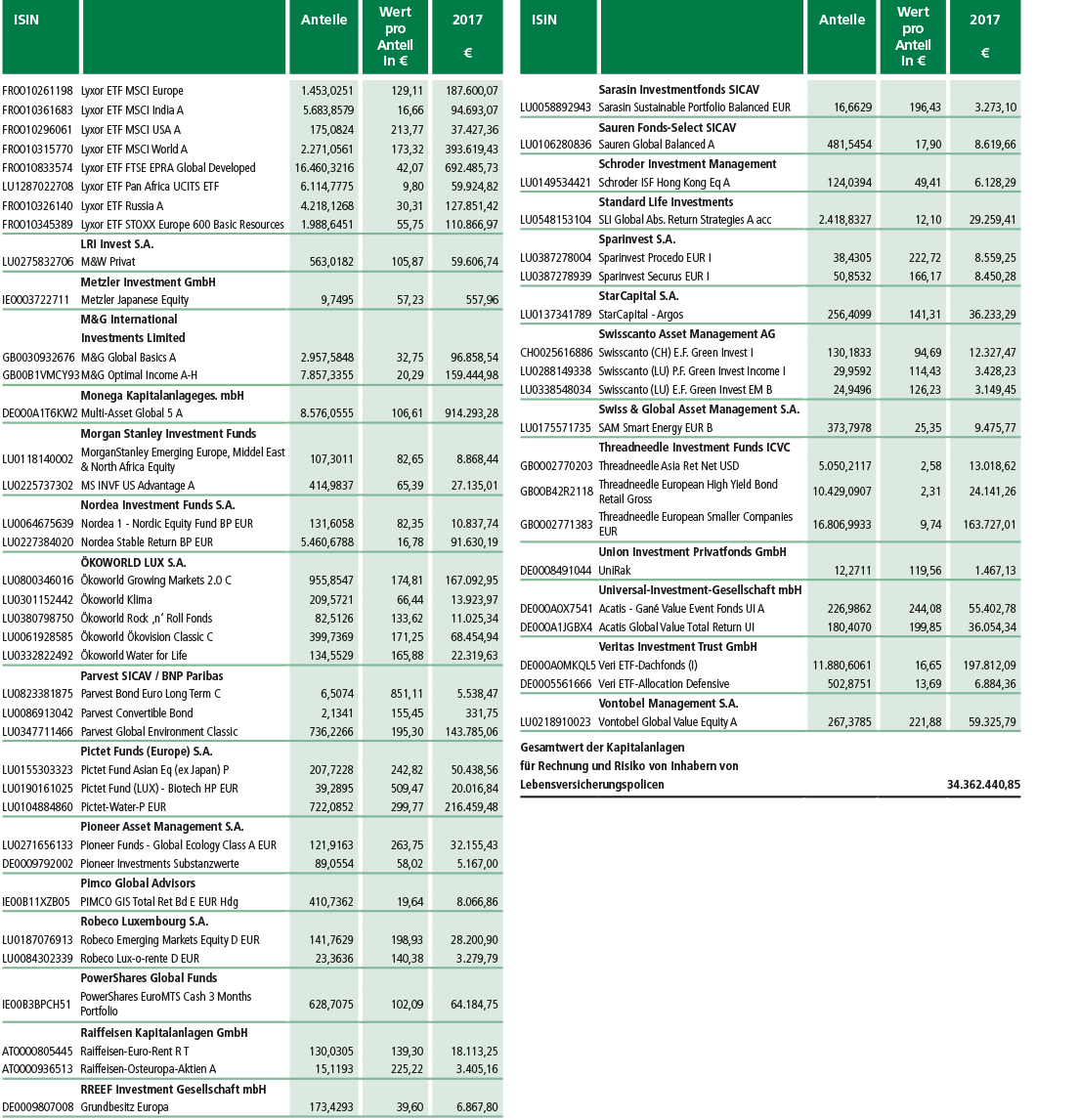 Die InterRisk Lebensversicherungs-AG hält 100 % der Anteile der InterRisk Informatik GmbH und der AMADI GmbH. Der Jahresüberschuss 2017 belief sich bei der InterRisk Informatik GmbH auf 1 Tausend Euro bei einem Eigenkapital von 40 Tausend Euro. Die AMADI GmbH erwirtschaftete einen Jahresüberschuss von 1,2 Tausend Euro bei einem Eigenkapital von 38 Tausend Euro. Die Bewertung erfolgt zu Anschaffungskosten. Die in Tabelle auf Seite 19 angegebenen Zeitwerte entsprechen den Buchwerten. Beide Gesellschaften haben ihren Sitz in Wiesbaden.