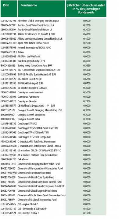 Für Versicherungen nach den Tarifen AFRV, AFRVE, AFRVB, AFRVBE , SFRV, SFRVE, SFRVB, SFRVBE wird eine fondsabhängige Überschussbeteiligung in % des jeweiligen Fondswerts gegeben: