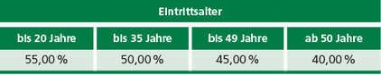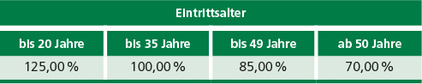 Ist anstelle des Sofortrabattes ein Todesfallbonus vereinbart, so erhöht sich die für den Todesfall versicherte Summe um den Prozentsatz gemäß nachfolgender Tabelle (der Todesfallbonus ist bei Verträgen gegen Einmalbeitrag obligatorisch):