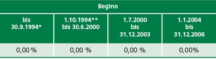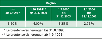 Für Berufsunfähigkeitsversicherungen im Rentenbezug wird eine Verzinsung gemäß Nr. 4.1 und 4.2 gewährt. Abweichend von den dort genannten Werten gilt für Berufsunfähigkeits-Zusatzversicherungen mit Vertragsbeginn bis 31.12.1993 ein Garantiezins von 3,00 % und ein Zinsüberschuss von 0,00% sowie bei Vertragsbeginn vom 1.1.1994 bis 31.3.1997 ein Garantiezins von 3,50 % und ein Zinsüberschuss von 0,00 %. Der in den Tabellen angegebene Garantiezins von 4,00 % und der Zinsüberschuss von 0,00 % gilt somit erst bei einem Vertragsbeginn ab dem 1.4.1997.