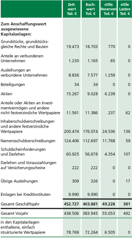 Die Bewertung erfolgte zum Anschaffungswert. Die positiven Bewertungsreserven belaufen sich auf 11.768 Tausend Euro, die stillen Lasten betragen zum Bilanzstichtag 59 Tausend Euro.