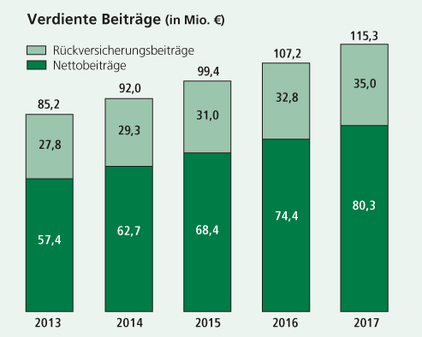 Die verdienten Bruttobeiträge stiegen um 7,5% – nach 7,8% in 2016 – auf jetzt 115,3 Millionen €. Da die Selbstbehaltsquote weiter von 69,4% auf nun 69,7% anstieg, konnten die verdienten Nettobeiträge um 8,1% auf jetzt 80,3 Millionen € erhöht werden.