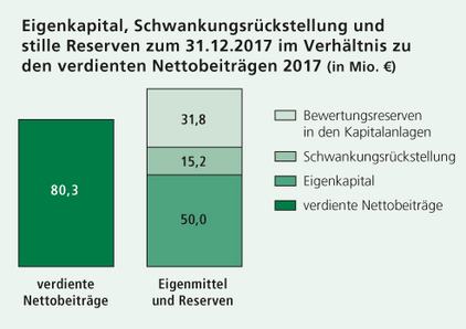 Neben der nach den Solvency II Vorgaben ermittelten Eigenmittelausstattung und Risikotragfähigkeit ist auch die aus den HGB Kenngrößen sichtbare Eigenkapitalausstattung nach wie vor hervorragend. Das Eigenkapital liegt mit 50,0 Millionen Euro bei 62,2% der verdienten Nettobeiträge. Die Summe aus Eigenkapital, stillen Reserven und Schwankungsrückstellung beläuft sich auf 121% der verdienten Nettobeträge.