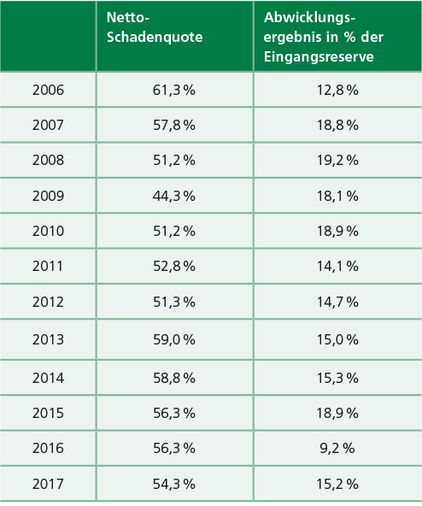In Bezug auf den Eintritt größerer Schäden begrenzen wir dieses Risiko durch Rückversicherungsverträge, die ausschließlich bei Rückversicherern mit hervorragender Bonität bestehen. Für Zwecke der HGB-Rechnungslegung dient darüber hinaus eine hohe Schwankungsrückstellung dem Ausgleich von Schwankungen im Schadenverlauf. Für eingetretene, aber noch nicht abschließend regulierte Versicherungsfälle bilden wir Rückstellungen, die sich jeweils am oberen Ende der Erwartungen orientieren. Unsere vorsichtige Reservierungspolitik zeigt sich auch an den sehr positiven Ergebnissen aus der Abwicklung von Vorjahresschäden. Die Abwicklung der Rückstellungen wird zudem ständig überwacht.