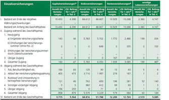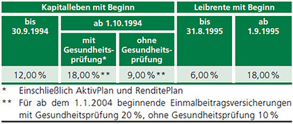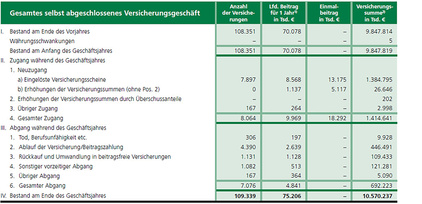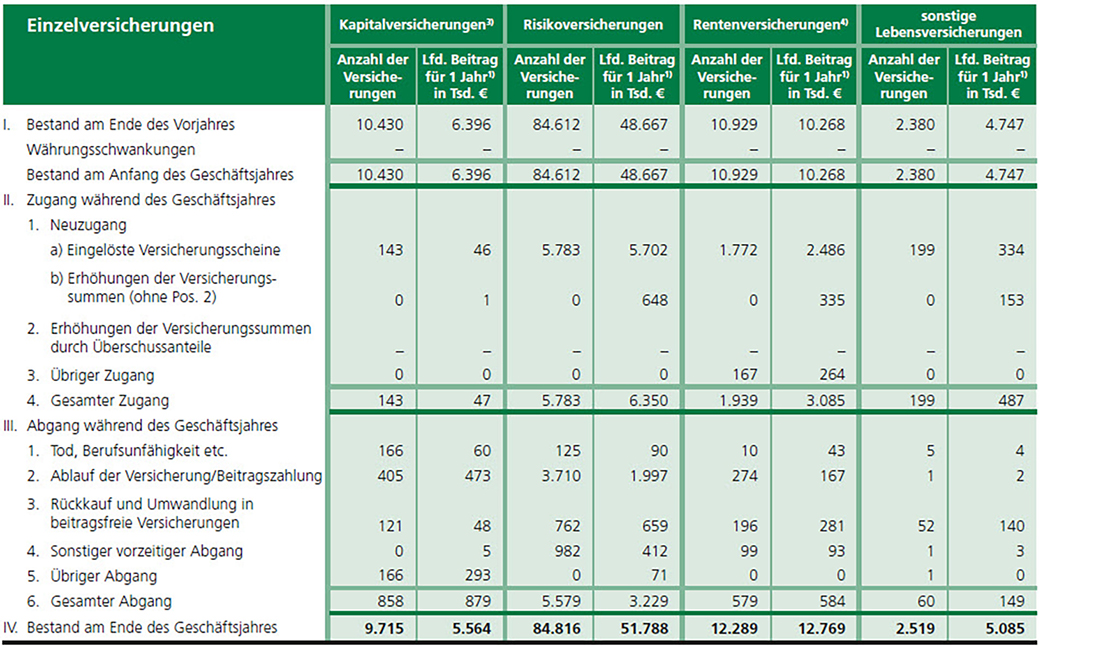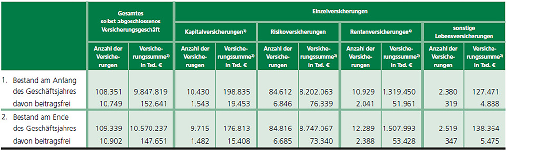 Als Rechnungsgrundlage für den Bestand an Aussteuerversicherungen dient die Heiratstafel 1960 / 62 für Ledige. Bei Leibrentenversicherungen wird für Abschlüsse bis 31.8.1995 die Sterbetafel ST 1987R, für Abschlüsse bis 31.12.2004 die Sterbetafel DAV 1994R und danach die Sterbetafel DAV 2004R angewandt.