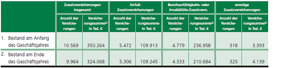 Nach Bildung der Zinszusatzreserve in Höhe von 21,3 Millionen Euro beträgt der bilanzielle Rechnungszins 1,83 %. Die Zinszusatzreserve wurde für den Neubestand gemäß § 5 Absatz 4 Deckungsrückstellungsverordnung gebildet. Die Berechnung der Zinsverstärkung im Altbestand erfolgte mit einem Rechnungszins von 1,9 % gemäß dem genehmigten Geschäftsplan.