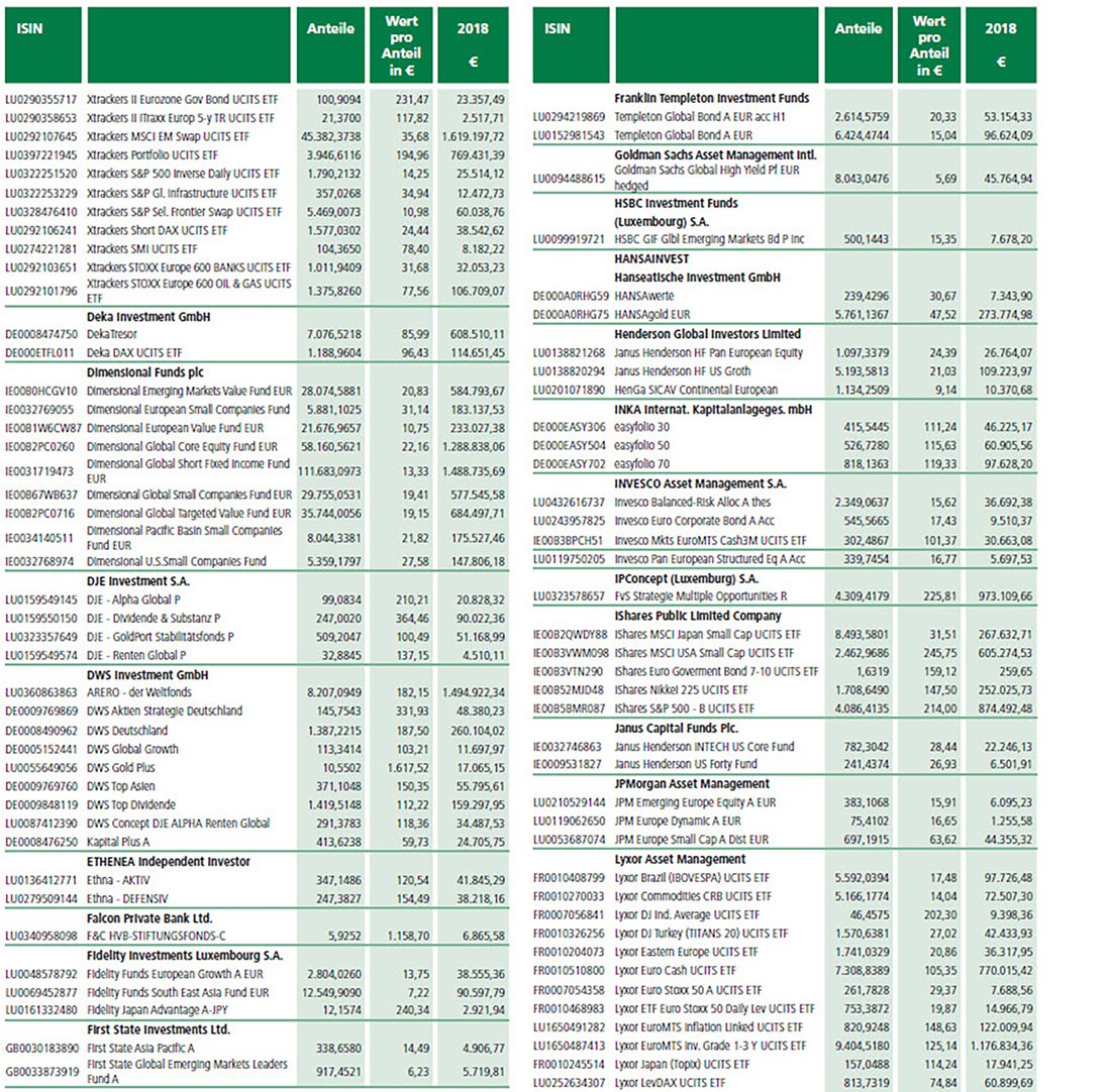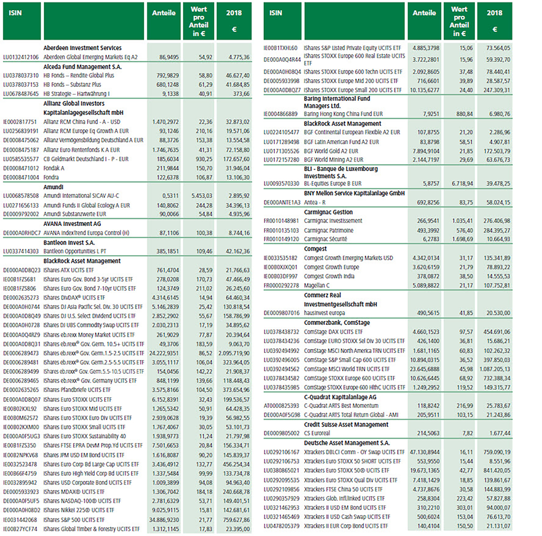 Die Bewertung der dem Umlaufvermögen zugeordneten Aktien, Anteile oder Aktien an Investmentvermögen erfolgt nach dem strengen Niederstwertprinzip. Sie werden zum Zeitwert, höchstens jedoch zu Anschaffungskosten, angesetzt. Wurden Aktien, Anteile oder Aktien an Investmentvermögen gleicher Art und Gattung zu unterschiedlichen Anschaffungskosten erworben, so wurde daraus ein Durchschnittsanschaffungswert gebildet. Die Zeitwerte wurden anhand der Börsenwerte und Rücknahmepreise zum 31.12.2018 ermittelt. Insgesamt beträgt die Abschreibung bei 104 Papieren 664 Tausend Euro. Die Zuschreibung bei vier Papieren beträgt 48 Tausend Euro. Die in dieser Position enthaltenen Immobilienfonds sind dem Anlagevermögen zugeordnet und wurden nach dem gemilderten Niederstwertprinzip bewertet. Für Investmentanteile mit einem Buchwert von 8.638 Tausend Euro ergaben sich stille Lasten von 77 Tausend Euro.