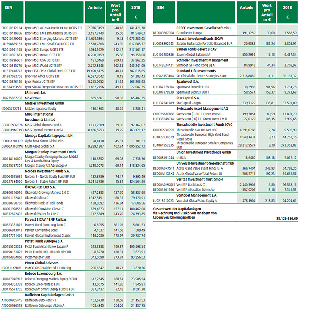 Die InterRisk Lebensversicherungs-AG hält 100 % der Anteile der InterRisk Informatik GmbH und der AMADI GmbH. Der Jahresüberschuss 2018 belief sich bei der InterRisk Informatik GmbH auf 1,1 Tausend Euro bei einem Eigenkapital von 41 Tausend Euro. Die AMADI GmbH erwirtschaftete einen Jahresüberschuss von 1,2 Tausend Euro bei einem Eigenkapital von 39 Tausend Euro. Die Bewertung erfolgt zu Anschaffungskosten. Die in Tabelle auf Seite 19 angegebenen Zeitwerte entsprechen den Buchwerten. Beide Gesellschaften haben ihren Sitz in Wiesbaden.