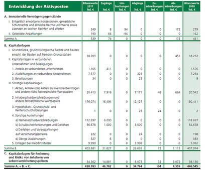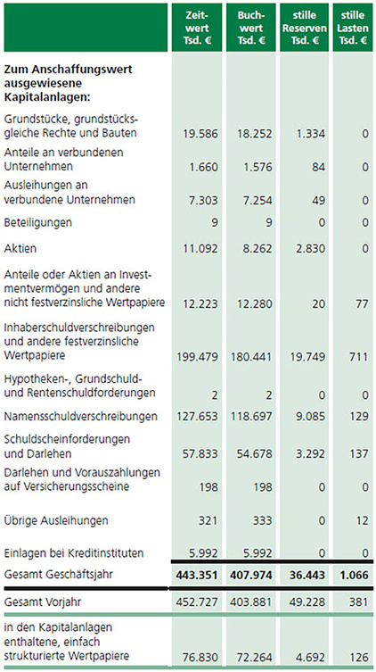 Bezüglich den Detailwerten gemäß § 54 Satz 3 Versicherungsunternehmens- Rechnungslegungsverordnung wird auf die Tabelle „Zeitwerte der Kapitalanlagen“ verwiesen. Die Gesamtsumme der Zeitwerte entspricht 443.351 Tausend Euro bei Buchwerten von 407.974 Tausend Euro und saldierten stillen Reserven von 35.377 Tausend Euro.