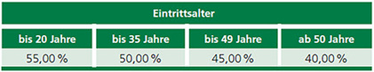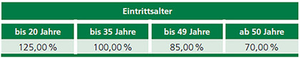 Ist anstelle des Sofortrabattes ein Todesfallbonus vereinbart, so erhöht sich die für den Todesfall versicherte Summe um den Prozentsatz gemäß nachfolgender Tabelle (der Todesfallbonus ist bei Verträgen gegen Einmalbeitrag obligatorisch):
