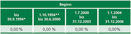 Für Berufsunfähigkeitsversicherungen im Rentenbezug wird eine Verzinsung gemäß Nr. 4.1 und 4.2 gewährt. Abweichend von den dort genannten Werten gilt für Berufsunfähigkeits-Zusatzversicherungen mit Vertragsbeginn bis 31.12.1993 ein Garantiezins von 3,00 % und ein Zinsüberschuss von 0,00% sowie bei Vertragsbeginn vom 1.1.1994 bis 31.3.1997 ein Garantiezins von 3,50 % und ein Zinsüberschuss von 0,00 %. Der in den Tabellen angegebene Garantiezins von 4,00 % und der Zinsüberschuss von 0,00 % gilt somit erst bei einem Vertragsbeginn ab dem 1.4.1997.