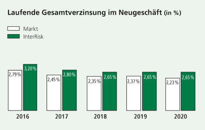 Aus der Ertragskraft der Kapitalanlagen kann in 2020 eine Zinsüberschussbeteiligung auf dem Niveau des Vorjahres geleistet werden. Zusammen mit dem garantierten Rechnungszins ergibt sich für Zuteilungen in 2020 für Verträge mit laufender Beitragszahlung mindestens ein Ansammlungszins von 2,65%, zusätzlich werden noch Schlussgewinnanteile gewährt, die sich bei der aktuellen Tarifgeneration auf 2,97% summieren. Damit bietet die InterRisk eine im Marktvergleich weit überdurchschnittliche Verzinsung.
