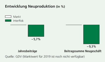 Nachdem die Neuproduktion in 2015 um 26,5%, in 2016 um 9,0%, 19,0% in 2017 und im Vorjahr nochmals um 24,0% gesteigert werden konnte, war im Geschäftsjahr ein Rückgang um 14,7% auf 7,3 Millionen € zu verzeichnen. Allerdings konnte in der größten Sparte Todesfallversicherung das Vorjahresniveau nach einem Anstieg von 36,5% in 2018 mit einem Rückgang von lediglich 2,6% annähernd wieder erzielt werden. Der Rückgang der Berufsunfähigkeitsversicherung von 1,8 Millionen € in beiden Vorjahren auf 1,4 Millionen € relativiert sich unter Berücksichtigung der Versechsfachung in 2017. In der Rentenversicherung wurden laufende Neuprämien in Höhe von 0,3 Millionen € nach 1,1 Millionen € im Vorjahr erzielt.