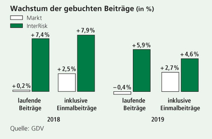 Die InterRisk behält ihren Fokus auf die Absicherung des Todesfall- und Invaliditätsrisikos bei. Dank preisgünstiger Tarife mit führenden Bedingungen im Bereich biometrischer Absicherung erwartet sie, ihren Marktanteil in diesem Segment wie in den Vorjahren weiter ausbauen zu können. Dabei profitieren die Kunden vom verlässlichen Wirtschaften: Die Gewinnbeteiligung für Risikolebens- und Berufsunfähigkeitsversicherungen in Form eines Sofortrabattes, der direkt mit den Zahlbeiträgen verrechnet wird, bleibt auf dem seit dem Bestehen der InterRisk unverändert hohen Niveau.