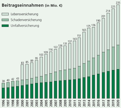 Die Beiträge beider Gesellschaften erreichten im Geschäftsjahr 2020 235 Millionen Euro und wuchsen damit im von der Corona-Pandemie geprägten Ausnahmejahr um 10 Millionen Euro. Die nachfolgend dargestellte Entwicklung der ursprünglich auf die Unfallversicherung spezialisierten InterRisk Versicherungs-AG beinhaltet ab 1995 die Beitragseinnahmen der zu diesem Zeitpunkt übernommenen Skandia Sachversicherung AG und ab 2000 die Beiträge der vom Generali-Konzern übernommenen Futura / InterRisk Lebensversicherungs-AG.