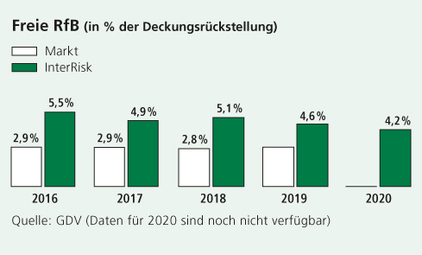 Der Rohüberschuss verbesserte sich um 0,3 Millionen Euro auf 40,5 Millionen Euro, obwohl die Zinszusatzreserve um 0,8 Millionen Euro höher als im Vorjahr dotiert wurde. Der als Puffer zum Ausgleich von Ertragsschwankungen dienende ungebundene Teil der Rückstellung für Beitragsrückerstattung (freie RfB) stieg im Verhältnis zur gesamten RfB von 50,7 % auf 52,6 %.