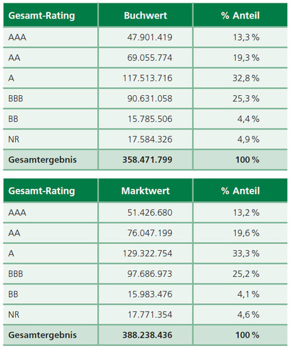 Die Kapitalanlage erfolgt ganz überwiegend bei deutschen oder innergemeinschaftlichen Emittenten angemessener Bonität. Ratings werden regelmäßig beobachtet und auf die Einhaltung zumindest des Investmentgrade-Status geachtet.