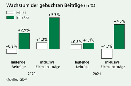 Im zweiten durch die Covid-19-Pandemie geprägten Jahr hatte die deutsche Lebensversicherung einen Prämienabrieb um 1,7 % zu verzeichnen. Die InterRisk konnte dagegen ihre gebuchten Bruttobeiträge um 4,5 % auf 105,9 Millionen € steigern. Auf laufende Beitragszahlung entfielen dabei 81,1 Millionen €, was einem Wachstum um 1,1 % entspricht, gegenüber 0,8% im Markt. Die Einmalbeiträge incl. Zuzahlungen stiegen um 16,0 % auf 24,8 Millionen €; die Branche berichtete hier einen Rückgang um 5,7 %. Da die verdienten Rückversicherungsbeiträge etwas stärker um 6,4 % stiegen, wuchsen die verdienten Nettobeiträge leicht unterproportional um 4,3 % auf 96,6 Millionen €. Die Beitragsentwicklung resultiert aus Zugängen und Abgängen von Versicherungen im Jahresverlauf, über deren wichtigste Größen im Folgenden berichtet wird.
