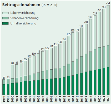 Die Beiträge beider Gesellschaften erreichten im Geschäftsjahr 2022 254 Millionen € und wuchsen damit um 11 Millionen €. Die nachfolgend dargestellte Entwicklung der ursprünglich als Unfallversicherer gegründeten InterRisk beinhaltet auch die private Sach- und Haftpflichtsparte und ab 2000 die Beiträge der InterRisk Lebensversicherungs-AG.