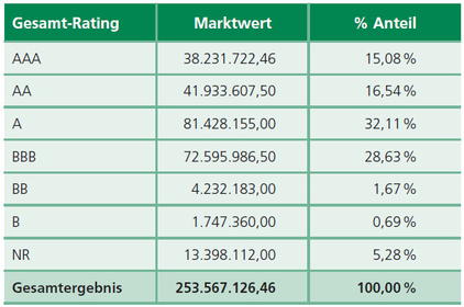 Die Kapitalanlage erfolgt ganz überwiegend bei deutschen oder innergemeinschaftlichen Emittenten angemessener Bonität. Ratings werden regelmäßig beobachtet und auf die Einhaltung zumindest des Investmentgrade-Status geachtet.